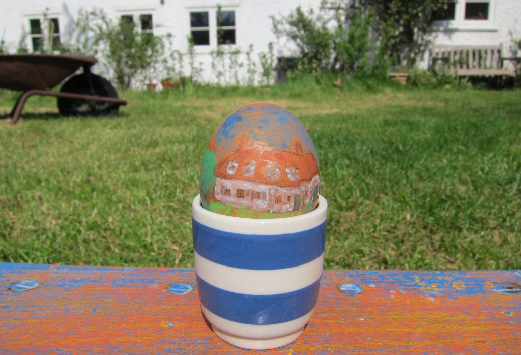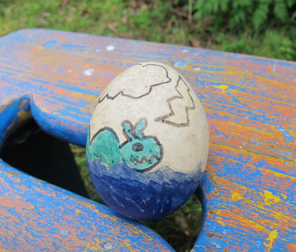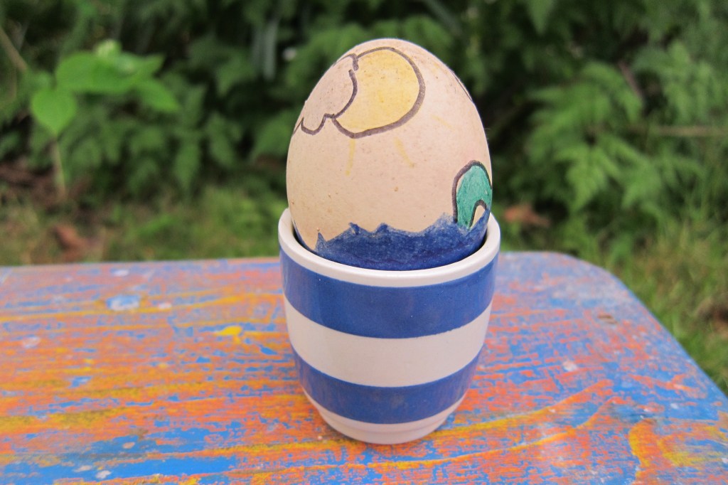 Once we get our eggs safely to the field, none of that matters. They are thrown, rolled and bounced down the hill until they break, at which point they are usually eaten. I don’t have many pictures of eggs from the past, although I intend to ask around the family and collect some more for next year. Occasionally, an egg survives several trips down the hill and is kept as a trophy. I accidentally broke my 2018 egg a day or so ago. I had planned to photograph it but it had somehow stuck in the egg-cup and shattered as I tried to pull it out. I still have my 2017 egg, slightly grubby from its three years in our dusty old cottage. The design reflects a slightly dark time in my life. A cartoon sea monster swims under a stormy sky. But just behind it, the sun peeps out from behind a cloud, as it did in real life.