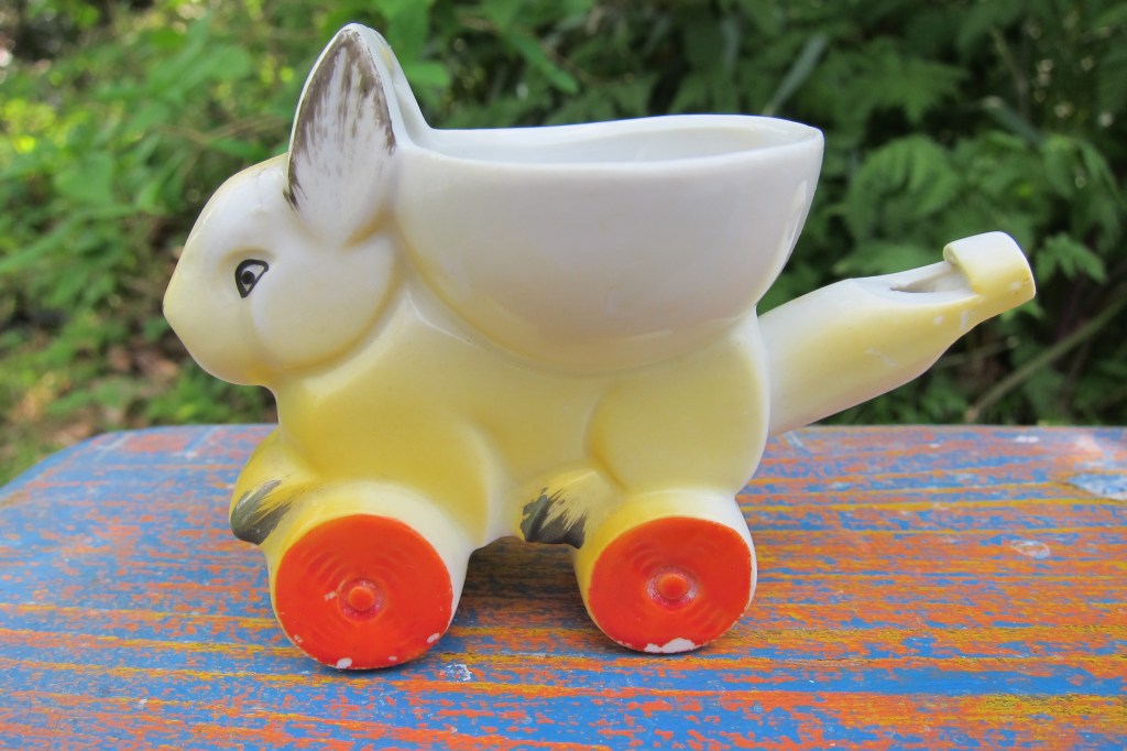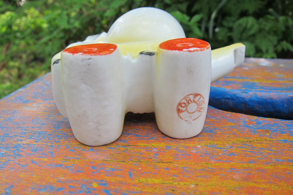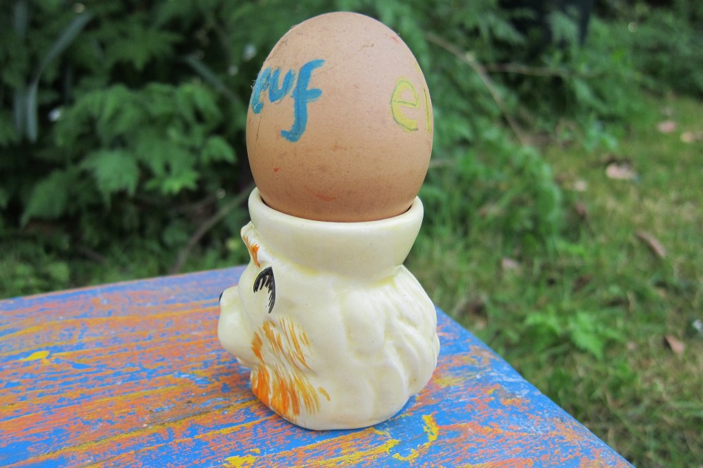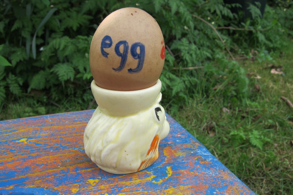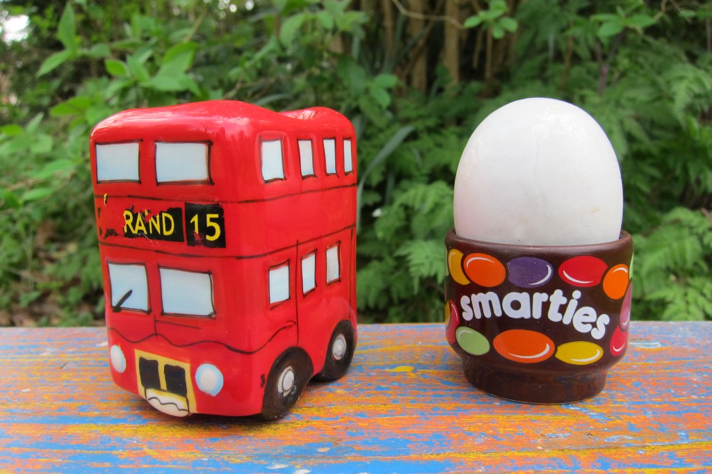 As I was photographing this year’s eggs, I brought out some interesting egg cups. The blue and white Cornishware ones are my husband’s favourite. The Number 15 bus belongs to my son. My husband found the lion at his mum’s house and the delightful rabbit whistle in a charity shop. The whistle works well, although I can’t help wondering how many eggs have been tipped out of it by its young owners. It also has an amusingly blunt “FOREIGN” stamp on its base, presumably from a time when anywhere not England was simply “foreign”. From a similar period is my Robertson’s egg cup. I love its proportions and the picture of the shop but it is so much “of its time” that I don’t feel able to display all of it. The modern Smarties egg cup holds a ceramic decoy egg. My dad once used a similar one to catch me with an April Fool.